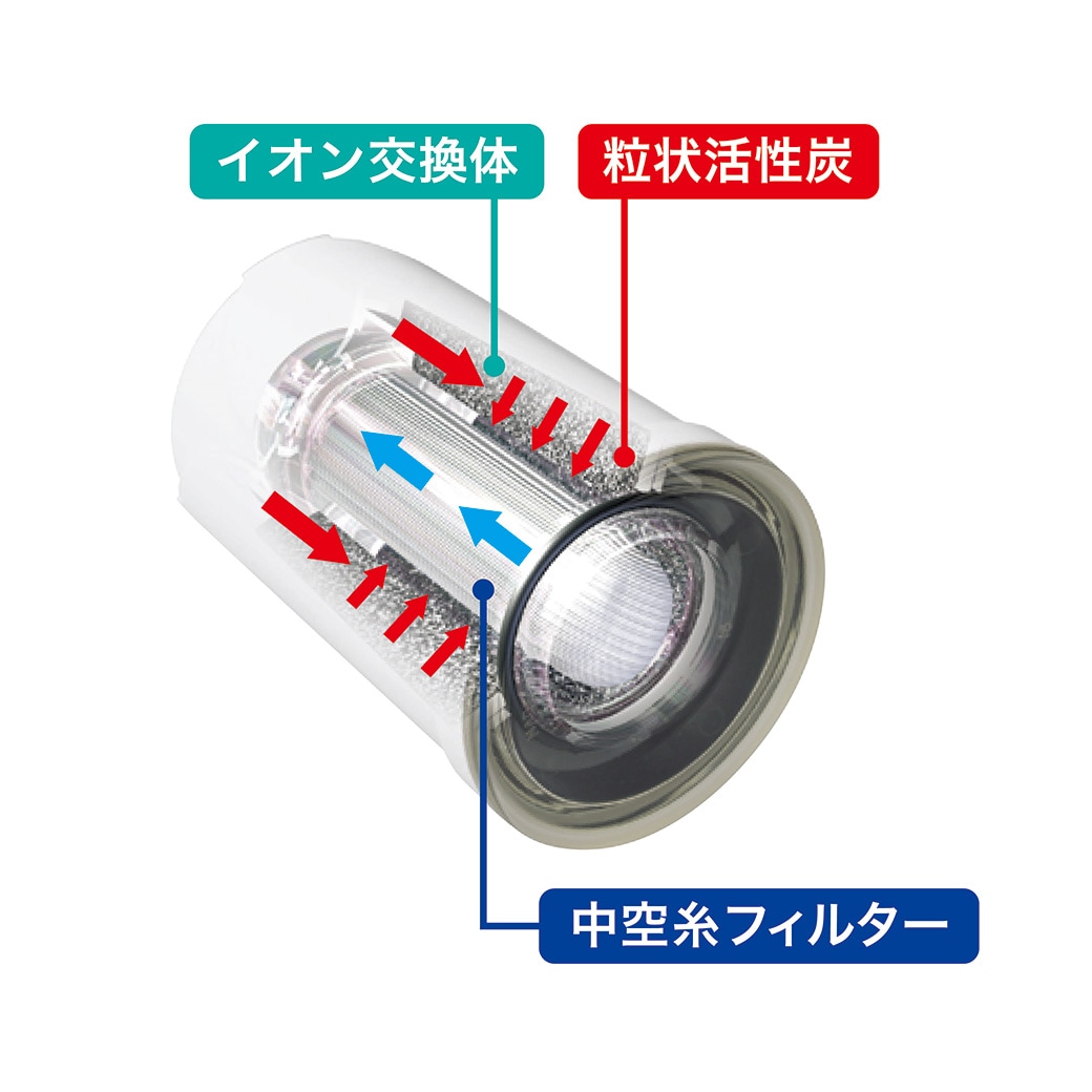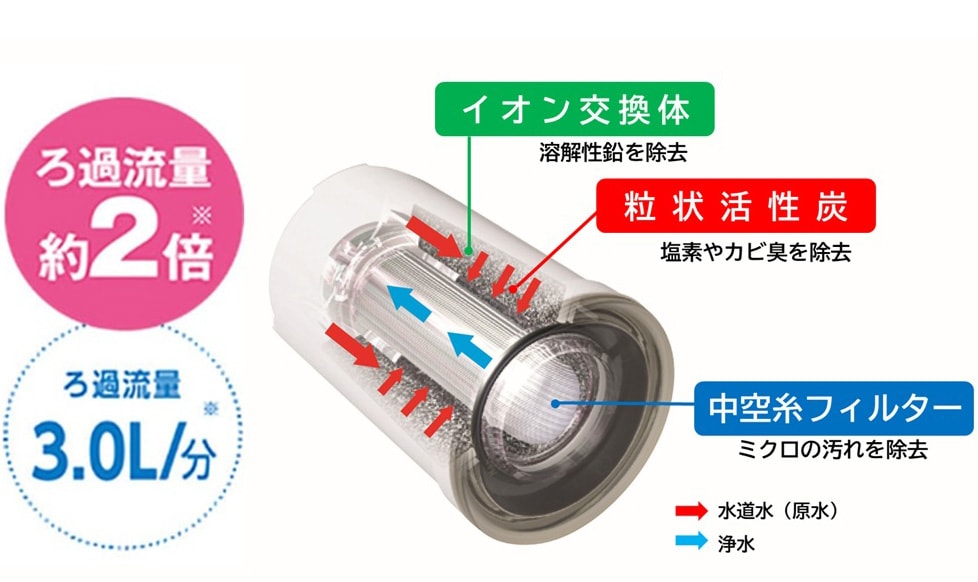 - 実際の水道水の水質やろ過流量などの違いによってろ材の取替時期の目安は変わることがあります。