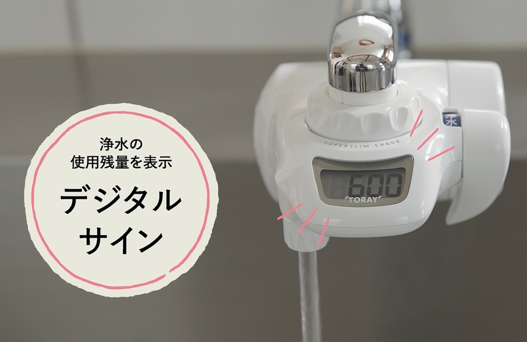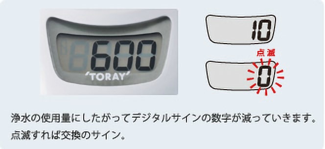 デジタルサインは浄水の総使用量を計測し表示しております。カートリッジ交換の目安としてご使用ください。