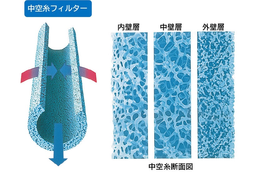 医療分野で活躍する東レのハイテク素材、中空糸フィルターがミネラル分は損なわずに、ニゴリ、鉄サビ、一般細菌、大腸菌、原虫類などミクロの汚れをキャッチ。