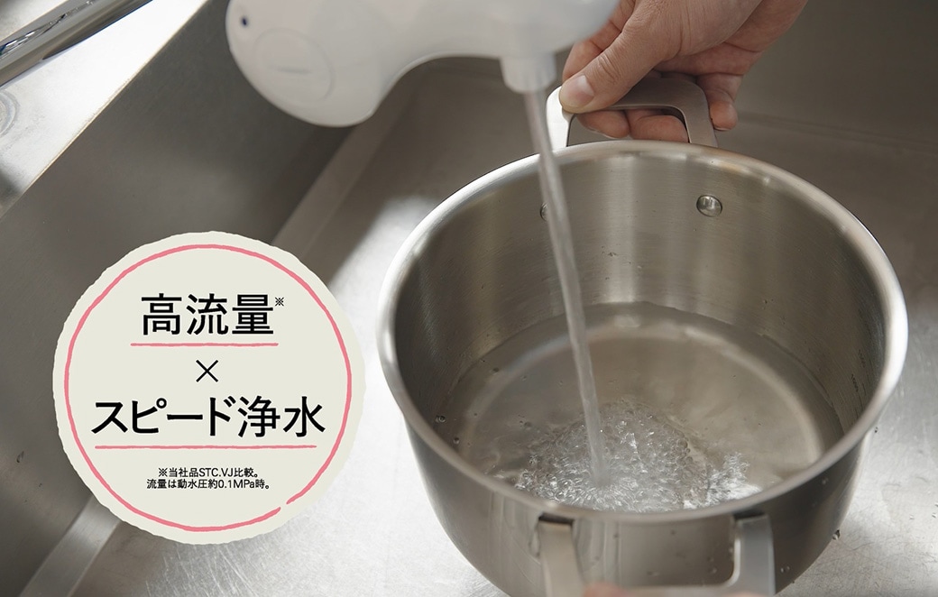 すぐに使える時短浄水!豊かな水流ですぐにたっぷり使えるので、料理がすばやくはかどります。